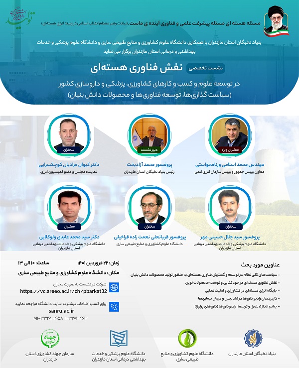 ✅ بنیاد نخبگان استان مازندران در نظر دارد با همکاری دانشگاه علوم کشاورزی و منابع طبیعی ساری و دانشگاه علوم پزشکی و خدمات بهداشتی و درمانی استان مازندران نشست تخصصی با موضوع «نقش فناوری هسته ای در توسعه علوم و کسب و کارهای کشاورزی، پزشکی و داروسازی کشور (سیاست گذاری ها، توسعه فناوری ها و محصولات دانش بنیان)» را برگزار نماید.